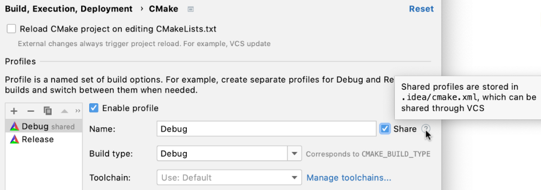 Note that only configuration file settings can be shared. For all configuration files, the option to reload the CMake project when editing CMakeLists.txt or other CMake configuration files is universal and stored in workspace.xml.