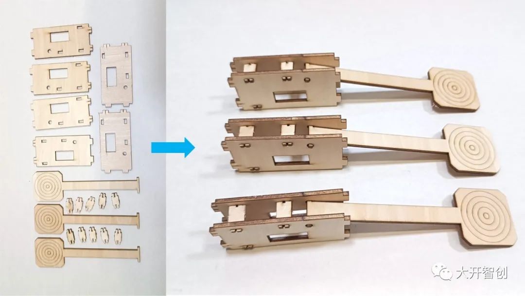 After the drawings are completed, use a laser cutter for cutting and processing. (The image shows the first cut parts; some parts were modified later)
