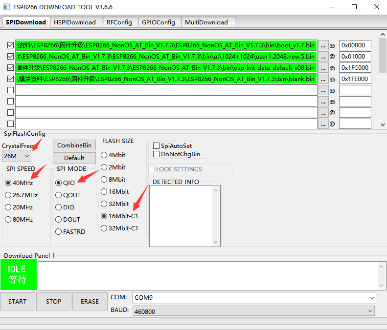 Select the four required firmware files (note that user1.2048.new.5.bin is from the at directory, not the at_sdio directory), configure the parameters as indicated by the arrow, and set the baud rate to 460800.
