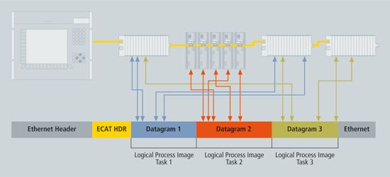 EtherCAT is an optimized protocol for process data, capable of directly transmitting within Ethernet frames due to its special Ethernet type. An EtherCAT frame can include several EtherCAT messages, each serving a specific memory area of a logical process image that can be up to 4GB in size. The data order does not depend on the physical order of the Ethernet terminals in the network and can be arbitrarily addressed. Broadcasting, multicasting, and communication between slaves are all achievable. When optimal performance is required, and EtherCAT components and controllers operate within the same subnet, direct Ethernet frame transmission will be beneficial.
