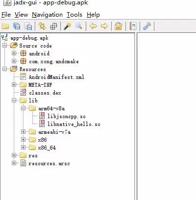 Therefore, native_hello.so depends on jsoncpp.so, which means jsoncpp.so must exist. So, adding this means that we are including jsoncpp.so in the apk. We can use jadx to check the apk built with the above so dynamic library integration, as shown: