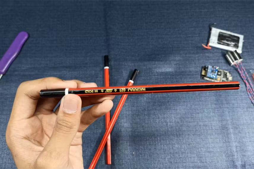Here, a wooden pencil was chosen and shaped into a quadcopter form.