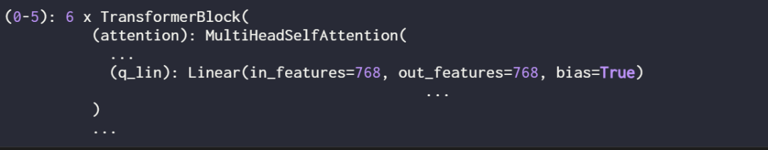 The output shows that the model consists of 6 transformer layers, including linear layers: