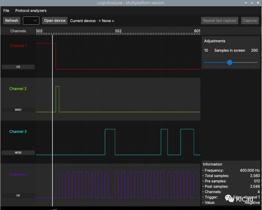 In addition to the hardware, the logic analyzer also includes powerful software (currently only supports Windows) where you can visualize the captured data, export the captured data, use protocol analyzers, etc.