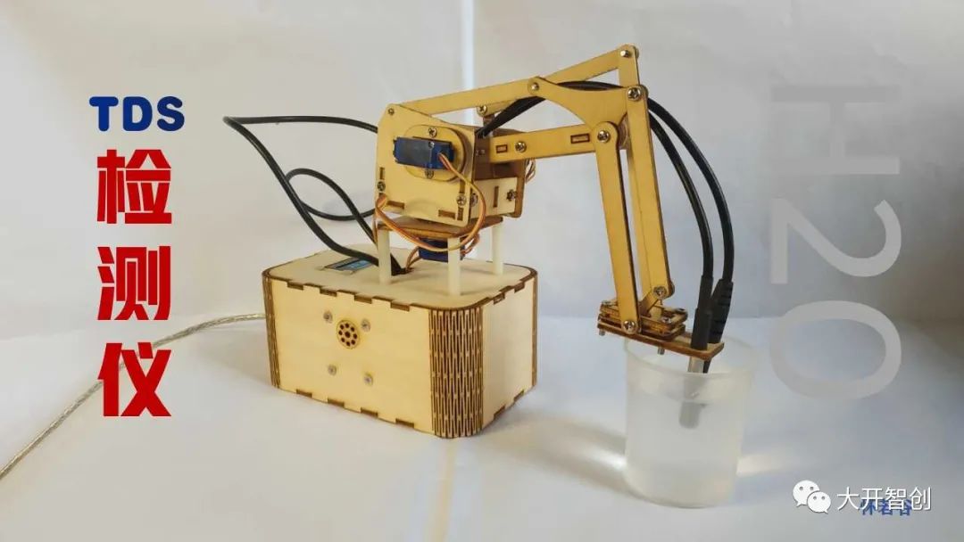 First, use an Arduino Uno as the main control board, connect the TDS sensor, DS18B20 temperature sensor, and LED display to create a TDS detection device. To make the experiment more convenient, I added a robotic arm driven by three 180° servos to hold the two probes while also using a voice recognition module and a voice synthesis module to execute commands and report results. This can be considered a highly intelligent TDS detection device.