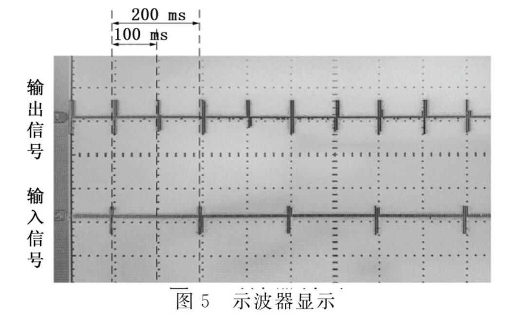 The signal timing fault injection experiment involved setting the TaskDelay() function for task timing delays, altering the signal sending interval during data forwarding. The experiment set the sending signal data period to 100 ms and TaskDelay() to 100 ms, conducting a fault injection experiment. The expected result is that the signal sending period changes to 200 ms. Using an oscilloscope to measure the waveforms before and after fault injection yields Figure 5, where significant differences are observed in the transmission periods of the upper and lower waveforms across multiple cycles. The oscilloscope measurements indicate a 100 ms phase difference between the input and output signal waveforms, with the output signal period changing to 200 ms, consistent with the expected experimental results, indicating successful signal timing fault injection. Changing the TaskDelay() function continues to yield successful fault injection across multiple experiments.