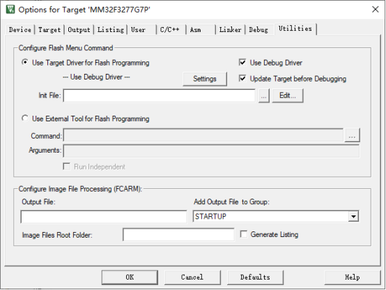 Additionally, some may ask why there is an INI file configured in the Utilities tab of the Option for Target window, but I did not include it in my configuration. This INI file contains data that configures the corresponding parameter values for the MCU’s internal address, which is used to set up the MCU before downloading the program. Generally, it configures the FSMC-related registers of the MCU and NOR FLASH to allow the download algorithm to operate NOR FLASH correctly. However, my configuration screenshot does not show this because the INIT function in the download algorithm has already implemented the FSMC initialization configuration, so there is no need to repeat this in the INIT FILE position.