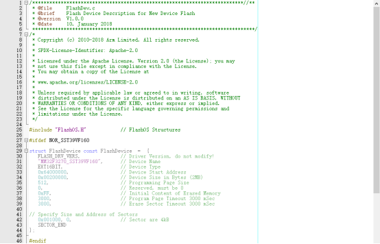 FlashDev.c is mainly used to describe storage characteristics, including Device Name, Device Type, Device Start Address, Device Size in Bytes, etc. The values of these characteristics can be filled in according to the characteristics of the NOR FLASH, and the programming timeout and erase timeout can be set longer for redundancy, as shown below: