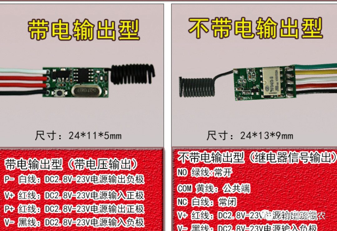 The receiving module can be categorized based on output type into powered output and non-powered output. Powered output means the output pin outputs low/high levels, with weak driving capability, usually unable to drive loads directly, often using MOS transistors to enhance driving capability. Non-powered output means adding a relay to the output stage of the receiving module, with actual output pins being the relay’s NO, COM, NC pins. By flying two wires on a non-powered output module, it can achieve powered output.