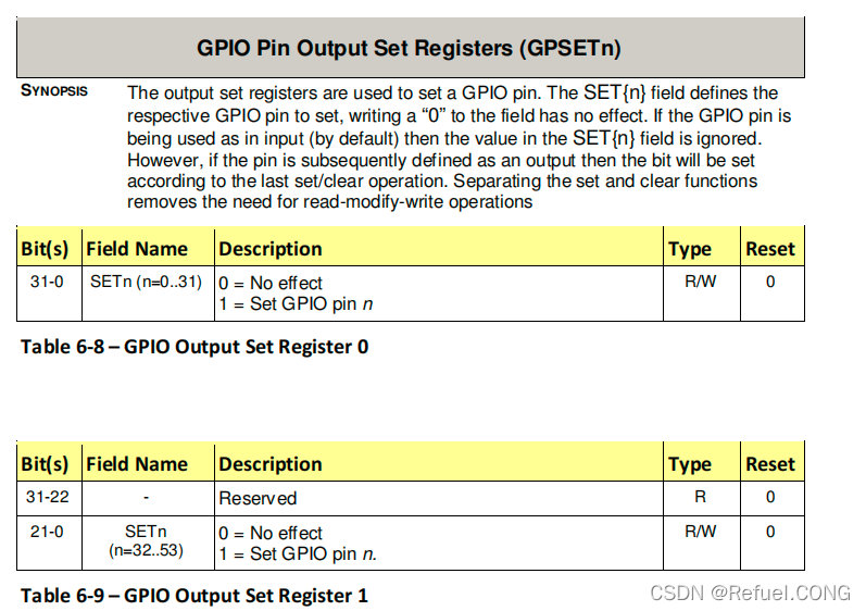 The output set register is used to set GPIO pins. The SET{n} field defines the respective GPIO pins; writing “0” to the field has no effect. If the GPIO pin is in input mode (by default), the value in the SET{n} field will be ignored. However, if the pin is subsequently defined as output, the bit will be set according to the previous set/clear operation. Separating set and clear functions eliminates the need for read-modify-write operations. GPSETn register is used to set the IO port to 1; the set4 bit sets the fourth pin, which is the fourth bit of the register.
