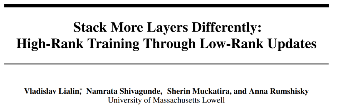 1. IntroductionAlthough various foundational models are continuously being released by academia and industry, it is undeniable that fully pre-training an LLM with elementary reasoning capabilities still requires enormous computational power. For example, the well-known LLaMA-6B model[1] requires hundreds of GPUs to complete training. Such a scale of computation has deterred most academic research teams. In this context, Parameter-Efficient Fine-Tuning (PEFT) has become a very promising research direction for LLMs. Specifically, PEFT methods can fine-tune billion-scale language or diffusion models on consumer-grade GPUs (such as RTX 3090 or 4090). Therefore, this article focuses on low-rank training techniques within PEFT, especially the LoRA method. The author reflects on a core principle in the development of deep learning over the past decade, which is to “stack more layers,” for example, the introduction of ResNet allows us to increase the depth of convolutional neural networks to over 100 layers, achieving very good results. Thus, this article explores whether stacking can similarly enhance the training efficiency of low-rank adaptation.This article proposes a low-rank update-based ReLoRA method to train and fine-tune high-rank networks, outperforming networks with the same number of trainable parameters, and even achieving performance similar to that of training full networks with over 100M parameters, as shown in the figure above. Specifically, the ReLoRA method includes (1) full-rank initialization, (2) LoRA training, (3) parameter restart, (4) jagged learning rate schedule, and (5) partial reset of optimizer parameters. The author chooses the currently popular autoregressive language model for experiments, ensuring that the GPU computation time for each experiment does not exceed 8 days.2. MethodologyThe author starts from the rank of the sum of two matrices. Generally speaking, the upper bound of the rank of the sum of matrices is tighter. For matrices, there exists a matrix such that the rank of the sum of the matrices is greater than or.The author aims to utilize this property to devise a flexible parameter-efficient training method, starting with the LoRA algorithm. LoRA can decompose the amount of model weight updates into a product of low-rank matrices, as shown in the following formula, where is a fixed scaling factor.