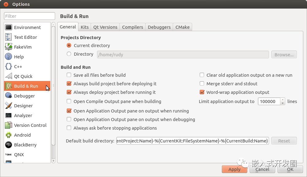 Then, in the Qt running interface, click on the menu bar “Tools –> Options –> Build&Run” to configure accordingly.