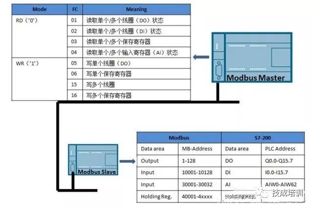 For the slave station, we only need to establish the correspondence between the Modbus standard address and the slave station address. The correspondence between the S7-200 slave station and the Modbus standard is shown in the table on the right side of the slave station.