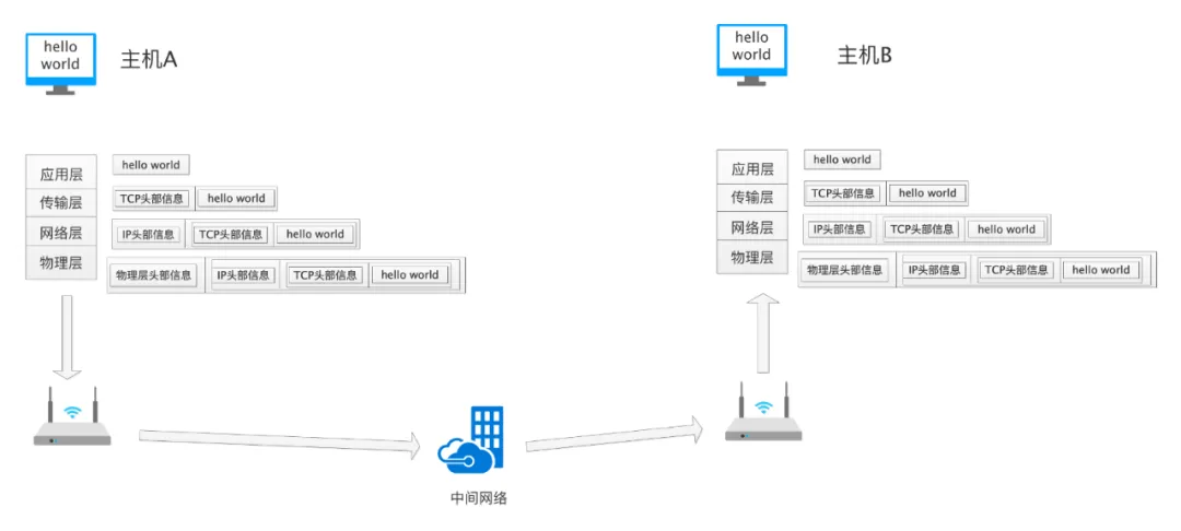 The image above shows the process of Host A sending “hello world” to Host B. After a user makes a request, the data travels from the application layer to the physical layer, with each layer adding additional information specific to that layer; at the receiving end, each layer removes its additional information and passes the remaining data to the upper layer for processing.