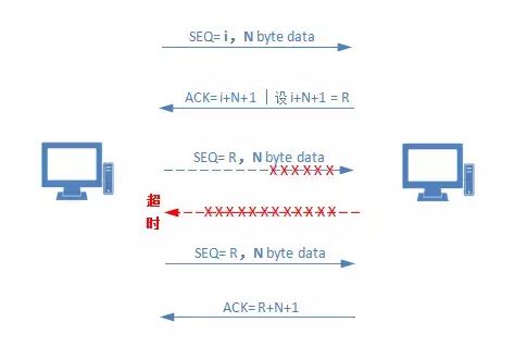 This diagram illustrates the process of transmitting 2 data packets. Host A sends the first N bytes of data to Host B, with SEQ set to i. After Host B receives it, it must immediately send an acknowledgment ACK packet back to Host A, with ACK = i + N + 1, so that Host A can confirm the data transmission was successful. During the transmission of the second data packet, SEQ value = R, and after Host B receives it, it immediately returns ACK, with ACK = R + N + 1. This process continues, and it is important to note that the sender only clears the data in the buffer after receiving the acknowledgment from the recipient.