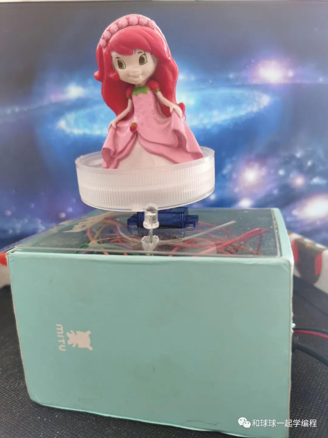 QiuQiu thought of the servo motor he used before. Using the servo motor to rotate the national flag, the same principle applies to any object placed on top.